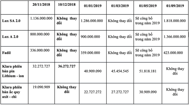 Đối với ô tô Lux và Fadil, mức giá "3 Không cộng ưu đãi" được duy trì từ nay đến hết ngày 31/8/2019, nhưng mức ưu đãi giảm dần theo 3 đợt: 1/1/2019; 1/5/2019 và về "3 Không" từ 1/9/2019. Cụ thể, khi về mức "3 Không", SUV Lux SA 2.0 có giá 1,818 tỷ đồng; Sedan Lux A 2.0 giá 1,366 tỷ và Fadil có giá 423 triệu đồng (giá chưa bao gồm VAT).